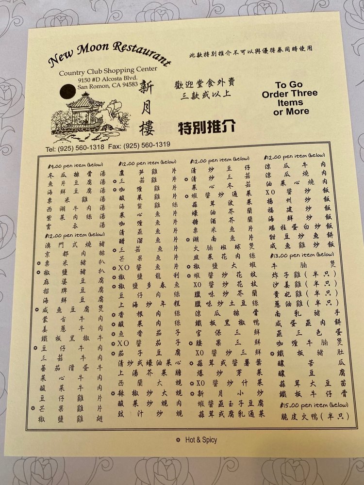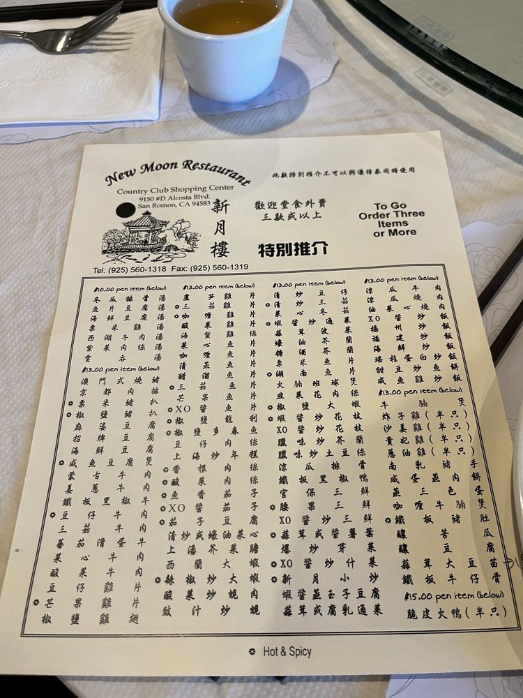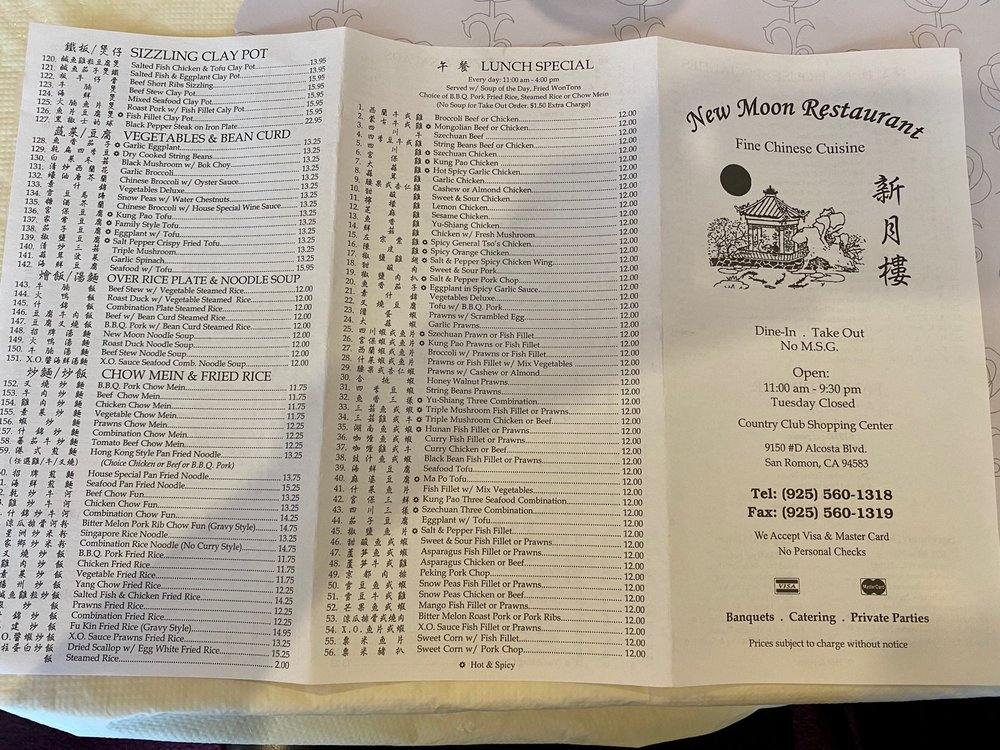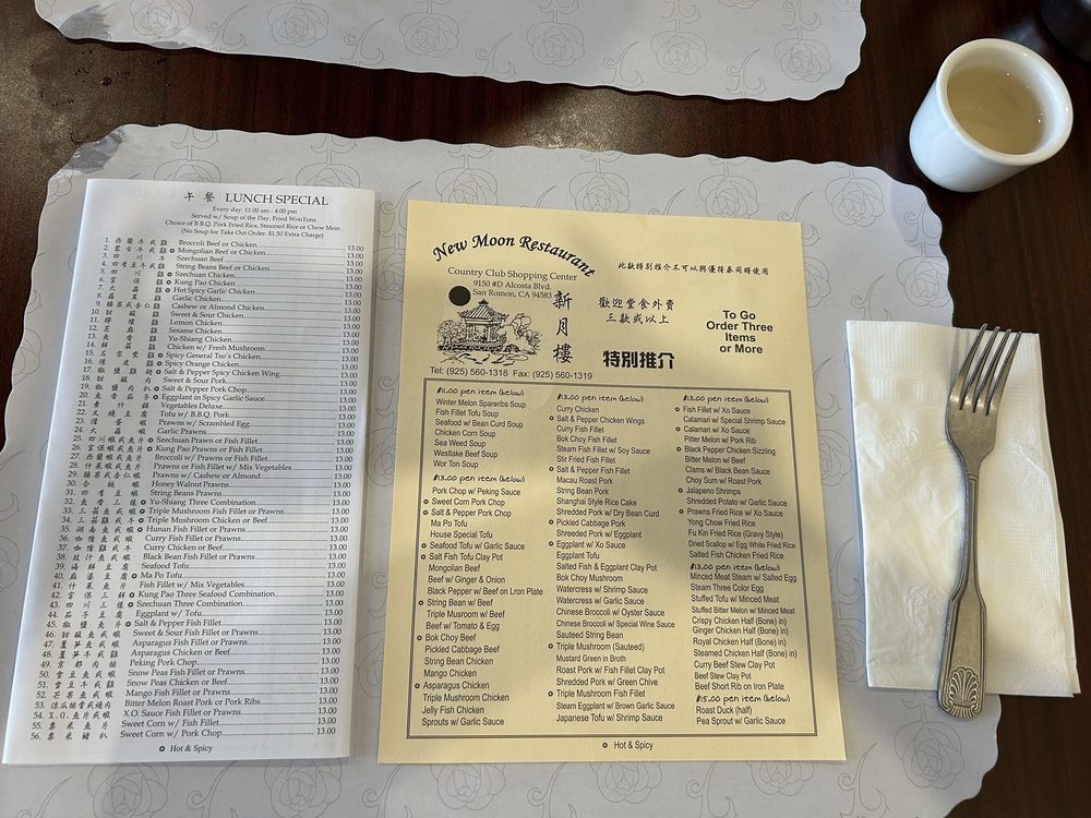 New Moon Restaurant, a Chinese eatery in San Ramon, CA, offers a diverse menu with options for vegetarians and vegans. Their appetizers range from traditional spring rolls and pot stickers to more unique dishes like foil wrap chicken and mango salad. The extensive soup selection includes favorites like hot and sour and seafood with bean curd. Lunch specials, priced at a reasonable $13, feature dishes like snow peas fish fillet and salt & pepper fish fillet, with generous portions and flavorful sides like BBQ pork fried rice. Customers rave about the fresh, flavorful food, with highlights being the honey walnut shrimp and salt and pepper pork. Despite the casual ambiance and friendly service, some suggest a need for updated decor. Overall, New Moon Restaurant stands out for its delicious dishes and convenient location near Walmart and CVS.