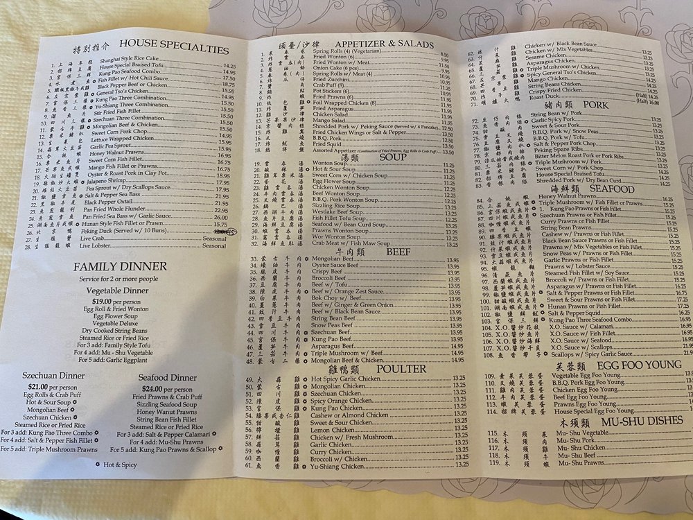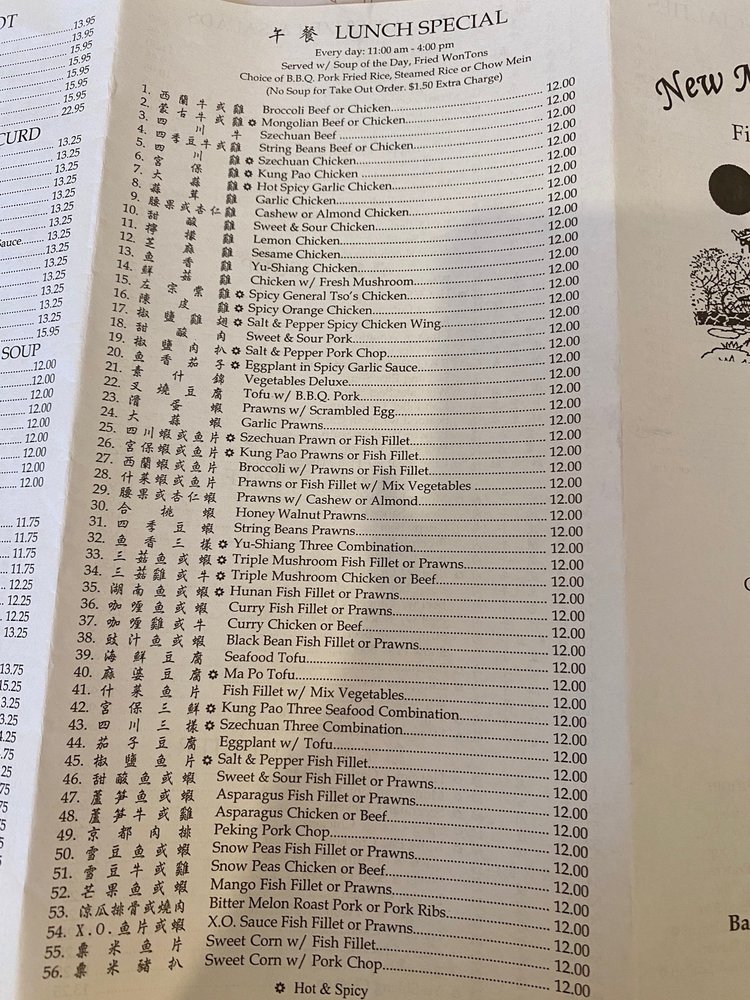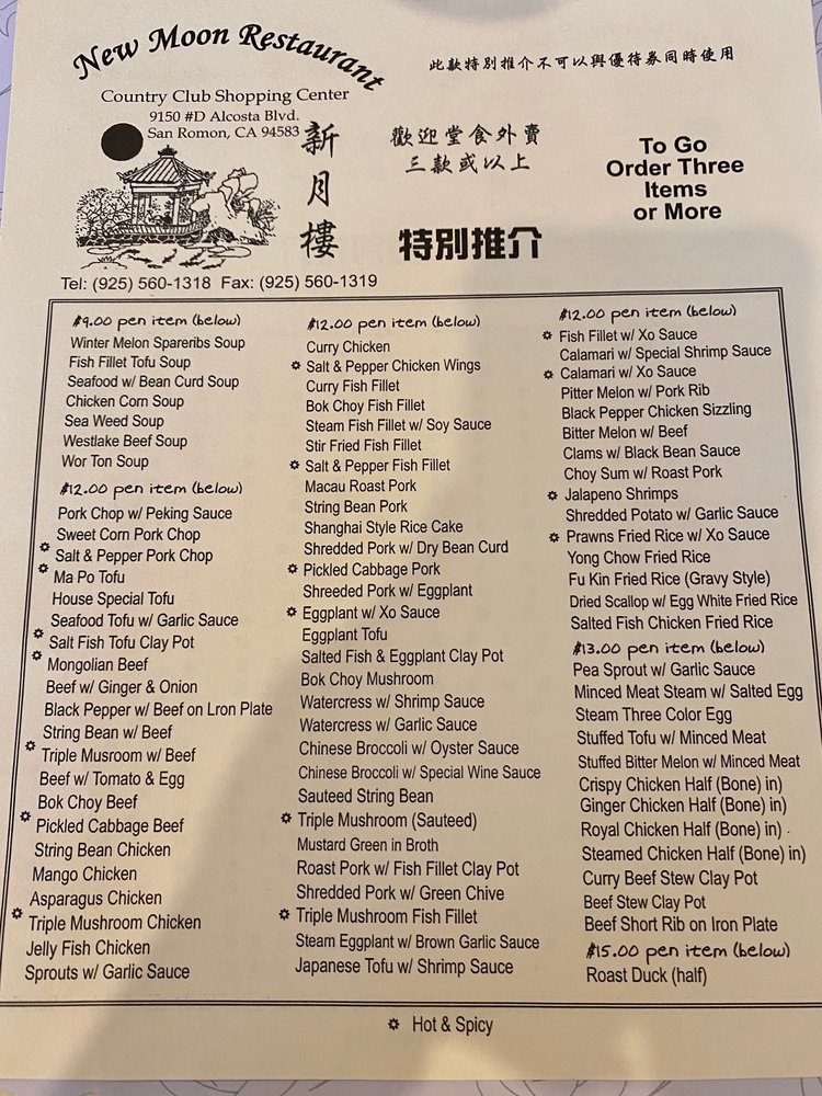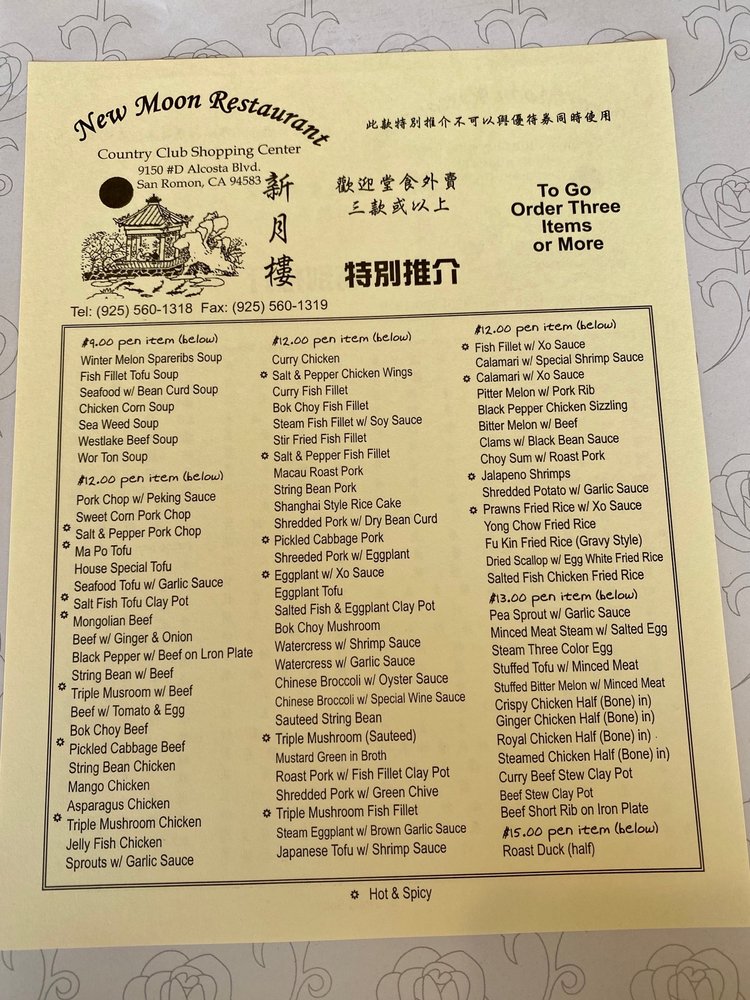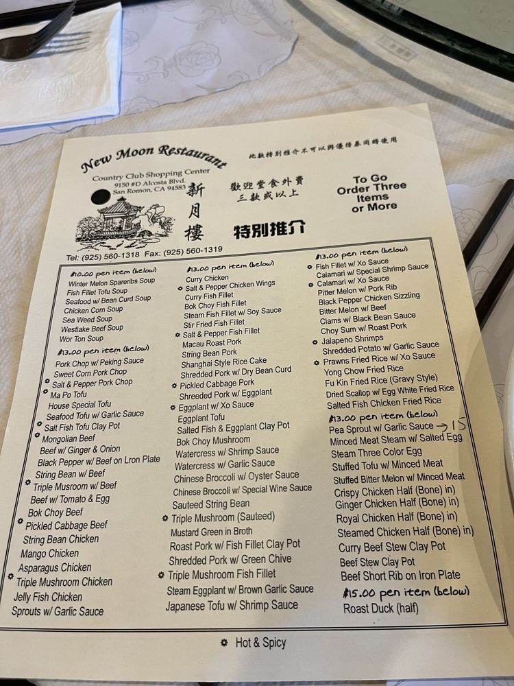 New Moon Restaurant, a Chinese eatery in San Ramon, CA, offers a diverse menu with options for vegetarians and vegans. Their appetizers range from traditional spring rolls and pot stickers to more unique dishes like foil wrap chicken and mango salad. The extensive soup selection includes favorites like hot and sour and seafood with bean curd. Lunch specials, priced at a reasonable $13, feature dishes like snow peas fish fillet and salt & pepper fish fillet, with generous portions and flavorful sides like BBQ pork fried rice. Customers rave about the fresh, flavorful food, with highlights being the honey walnut shrimp and salt and pepper pork. Despite the casual ambiance and friendly service, some suggest a need for updated decor. Overall, New Moon Restaurant stands out for its delicious dishes and convenient location near Walmart and CVS.